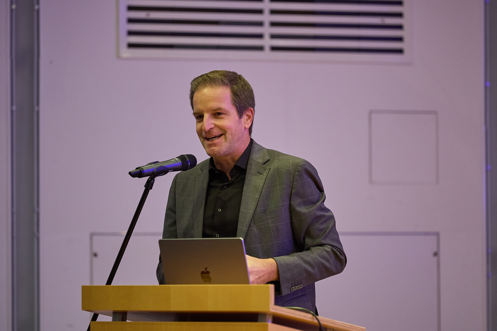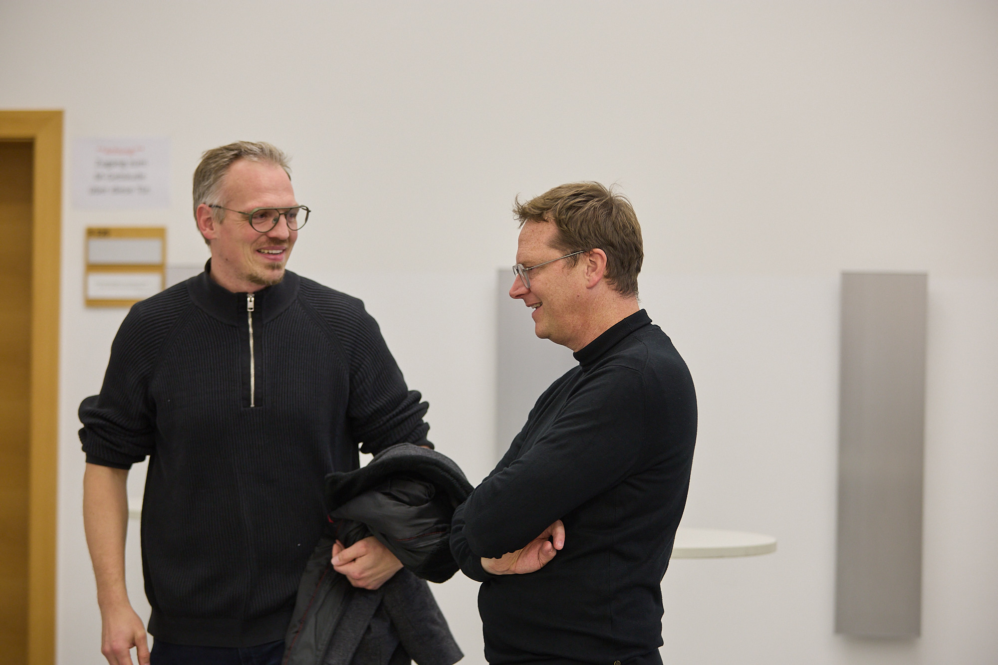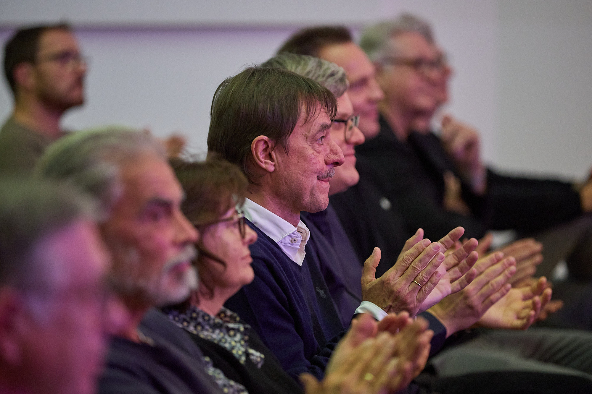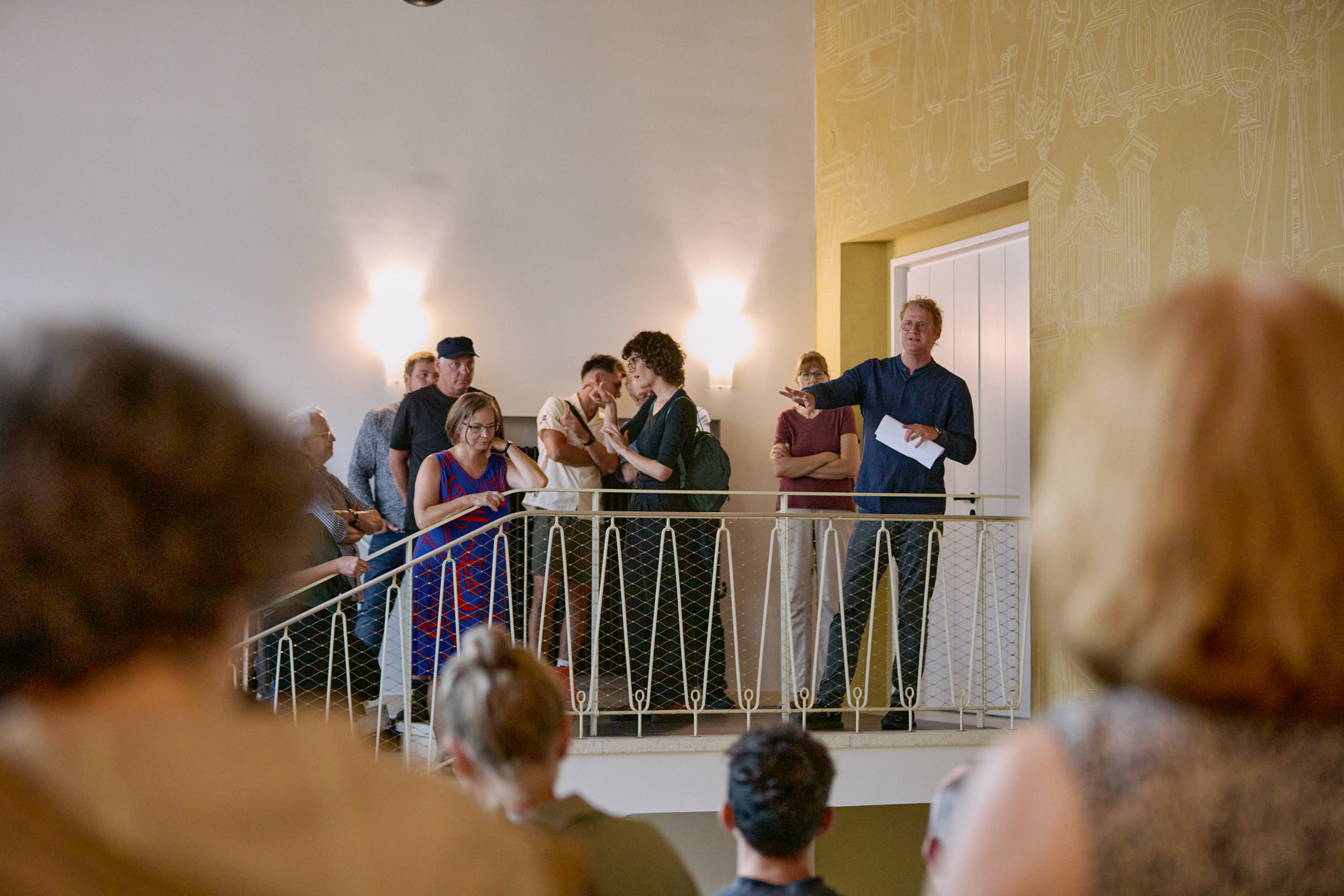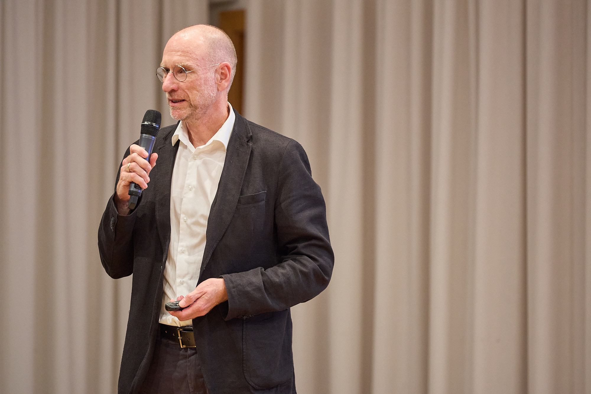Architekt Grischa Büttner vom Büro Grellmann, Kriebel, Teichmann, GKT & Partner Architekten BDA führte mit interessanten Details zum Denkmalschutzwert des Gebäudes der 50-Jahre, zum Erhalt historischer Bausubstanz und historischer Bauteile, zu CO2-gemindertem WDVS-Ersatz und Geräuschdämmung von Innenräumen für höchste Ansprüche durch das Mozartareal.